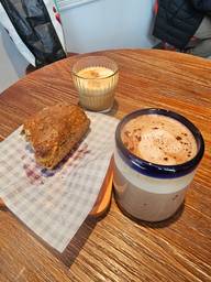 Flat white with macadamia milk was great. Chocolate blueberry scone was delicious. Cute little place, nice to sit outside in good weather on public sitting areas.