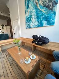 Doux flat white dans ce magnifique café. Il n'y a pas de table juste de banc, parfait pour prendre une petite pause avant de travailler!